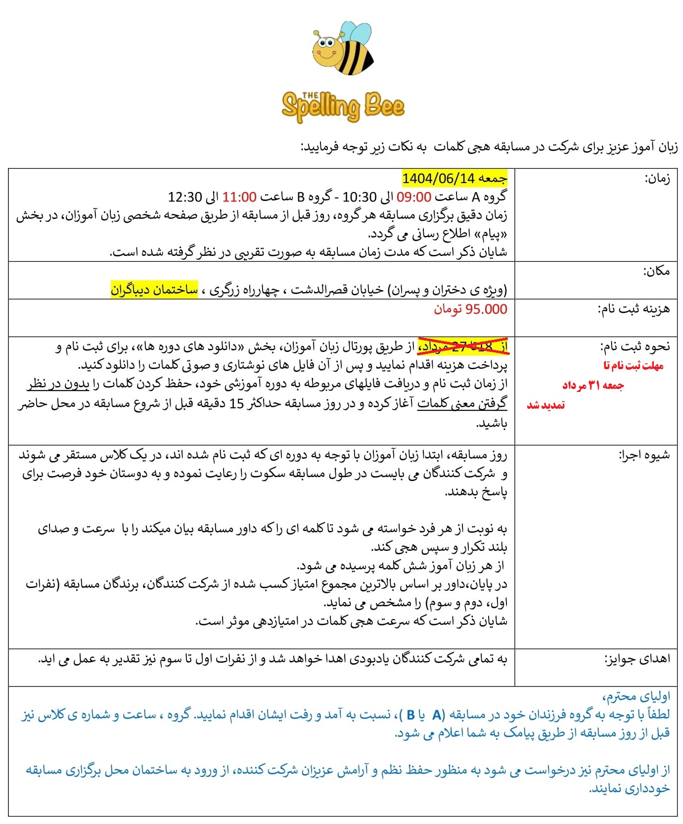 یازدهمین دوره مسابقات هجی کلمات Spelling Bee مؤسسه زبان نوید، در تابستان ۱۴۰۴ برگزار می شود.