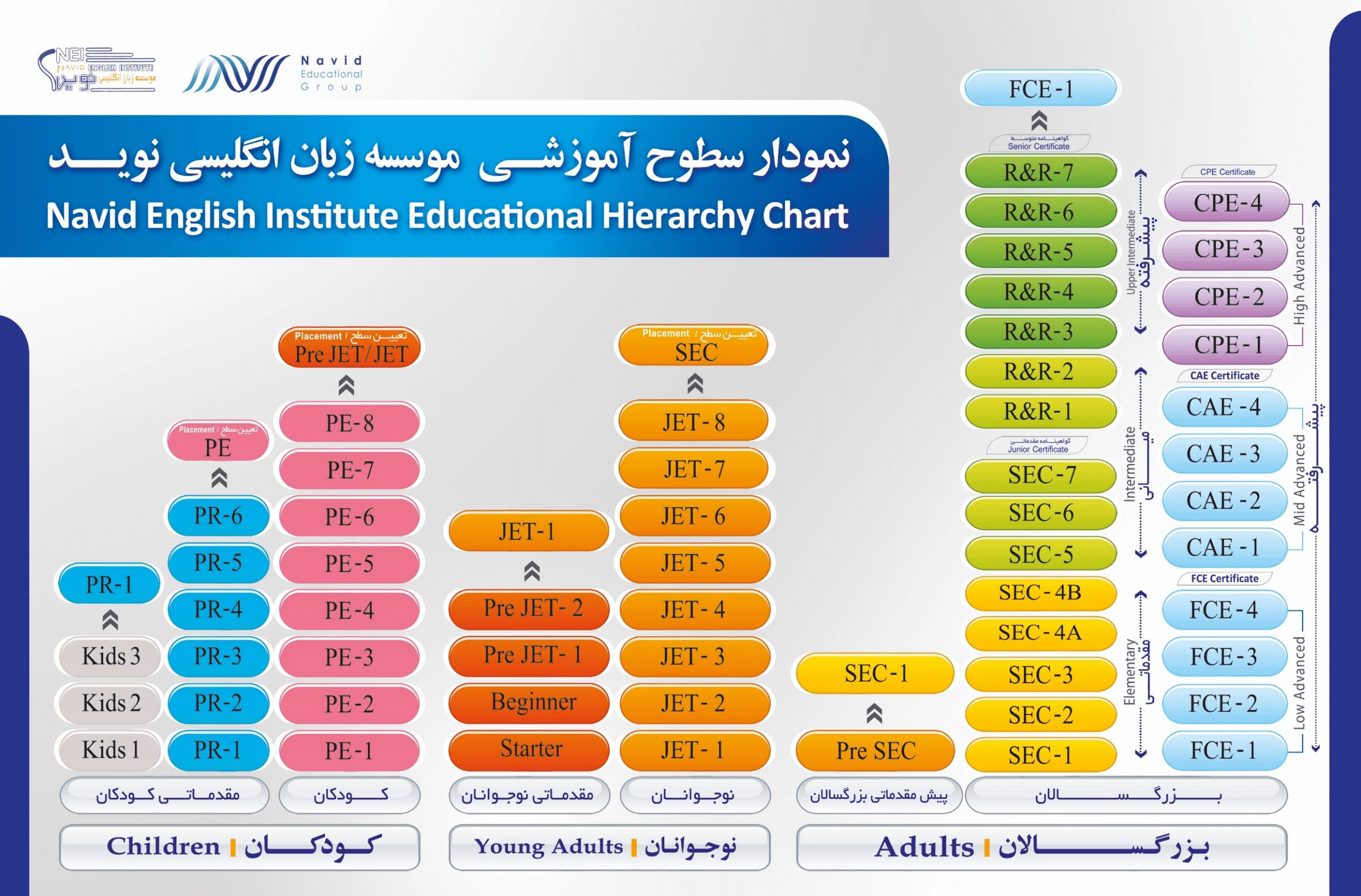 به منظور بهره وری بالاتر دوره های آموزشی، تفکیک گروههای سنی دپارتمانهای کودکان و نوجوانان، با دقت و حساسیت بالایی انجام می پذیرد، به گونه ای که زبان آموزان این دپارتمانها، در 5 بخش خردسالان، مقدماتی کودکان، کودکان، مقدماتی نوجوانان و نوجوانان، تفکیک می شوند.